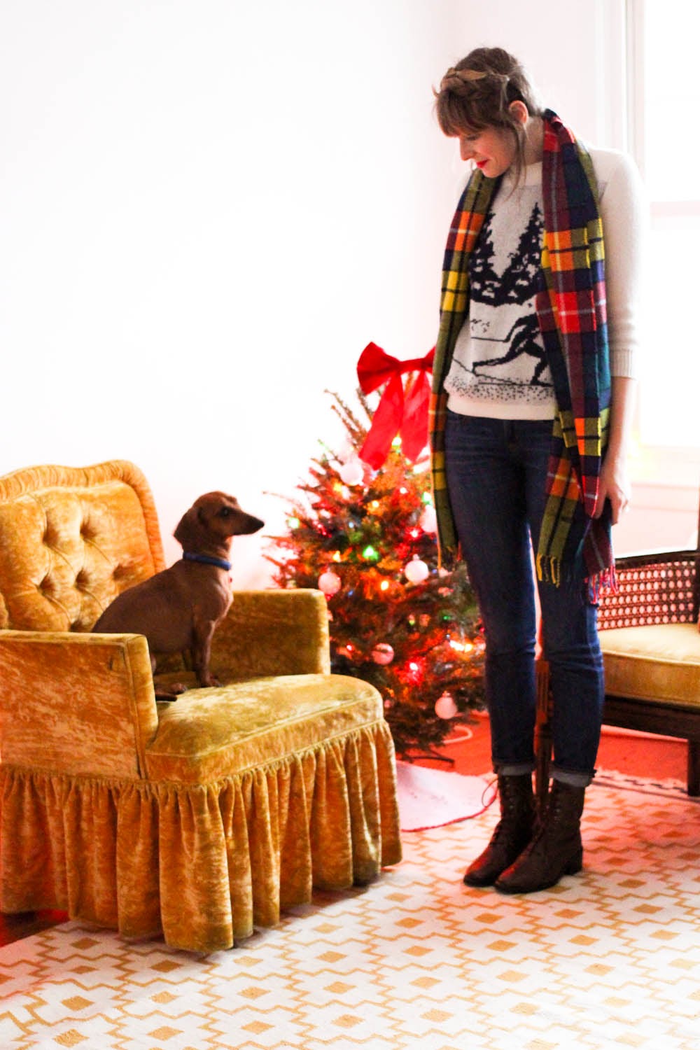 Matt has been out of town, so excuse the slow week on my blog 🙂 Here’s two looks that I’ve been re-wearing for this holiday season (and claude being the cutest thing ever). jeans, a festive sweater and a plaid scarf can never be wrong!! and a vintage pinafore dress… paired with this turtleneck that i snagged last year from j.crew because i knew someday i would live in NY and need it! gotta keep thinking ahead 🙂